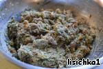 Смешать куриный фарш с луковой смесью, зеленью, имбирем, курагой, миндалем, посолить и поперчить по вкусу.