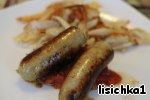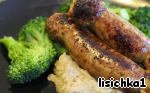 В первый раз концы колбасок были плохо закручены, поэтому они раскрылись и часть фарша вышла наружу, что видно на фото; вкусовые качества от этого не пострадали нисколько. В качестве гарнира мы сделали пюре из лука-шалота и вареную капусту брокколи. -