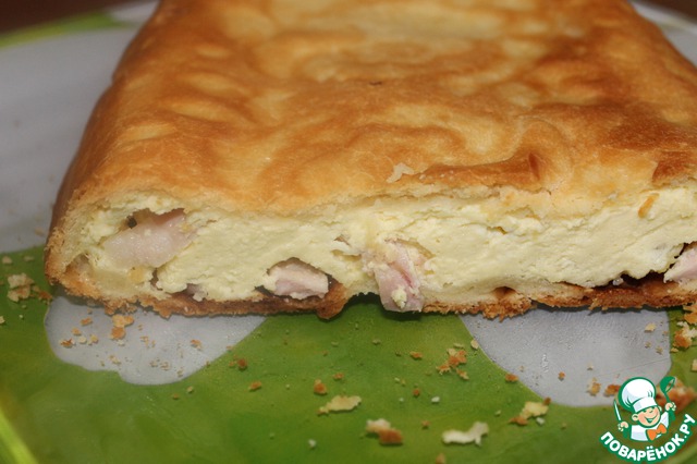 Раскатываем маленький кусок теста, выкладываем на начинку (на этом этапе муж попросил добавить ветчины в пирог, вы можете сделать то же самое. Это также может быть фарш, обжаренный с луком, резаные помидоры или болгарский перец или зелень петрушки). Заливаем оставшейся начинкой.