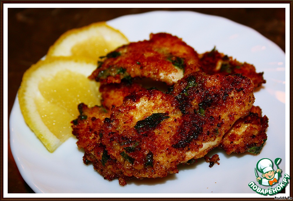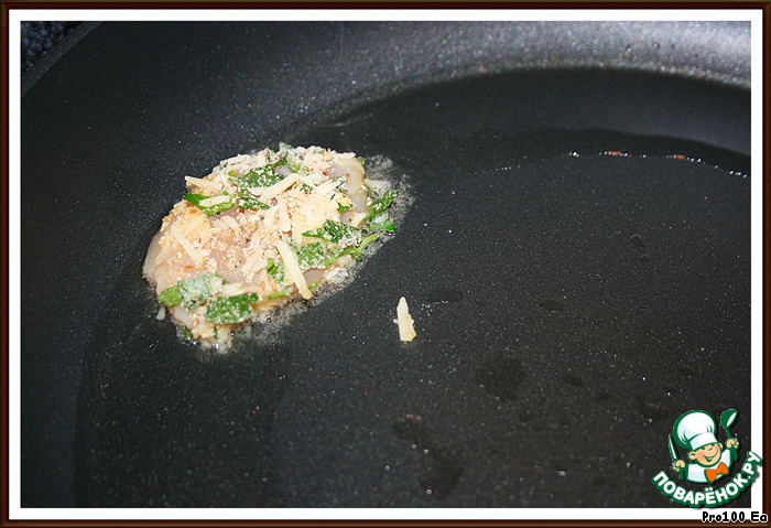 5. Кусочки мяса посолить, поперчить, обмакнуть в яйцо, потом в сухари и обжарить в оливковом масле.