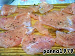 Куриное филе режем тонкими пластинами поперек волокон, слегка отбиваем молотком, солим и перчим по вкусу.