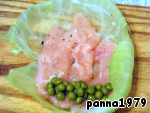Тут мне показалось, что так просто - неинтересно, и я решила разнообразить начинку. Поэтому предлагаю еще три варианта начинки, но полет Вашей фантазии не ограничен. Первый вариант: на капустный лист выкладываем куриное филе, с одной стороны выкладываем примерно столовую ложку консервированного горошка и формируем рулетик, как в первом случае.