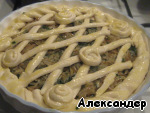 Сделать сеточку с розочками. Смазать желтком, дать расстояться минут 20 и поставить в духовку минут на 35.