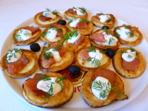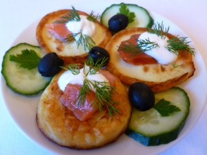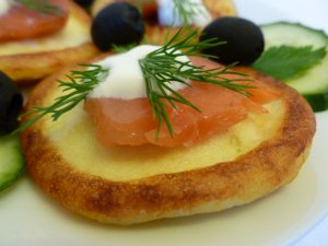 По рецепту журнала «Cosmopolitan». Эта закуска на столе появляется практически мгновенно (и исчезает с него так же). Сами блинчики можно испечь заранее, упаковать в герметичный контейнер и хранить в холодильнике несколько дней. Перед подачей их нужно будет только украсить ломтиками рыбки или красной икрой.