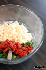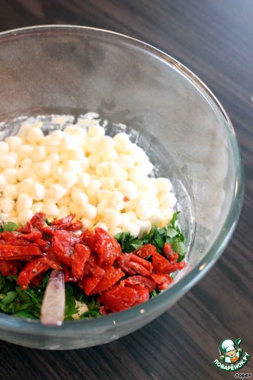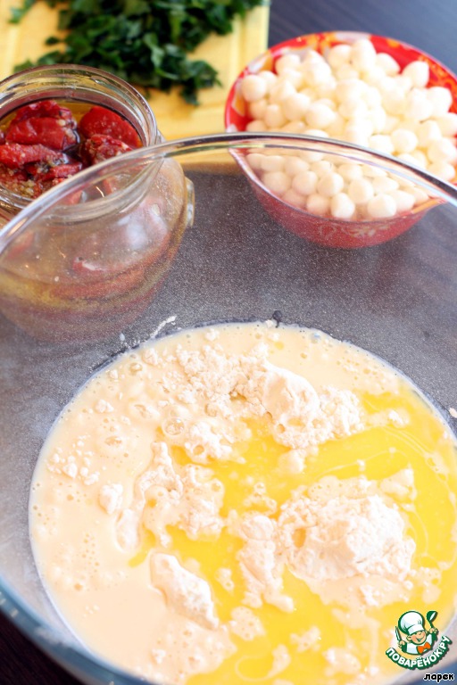 Если у вас крупная моцарелла, то ее надо порезать или порвать на более мелкие кусочки. В оригинальном рецепте автор использует свежие помидоры, я использовала вяленые томаты собственного приготовления. Томаты и базилик порезать. Добавить базилик, помидоры и моцареллу в тесто, аккуратно перемешать. Обязательно посолить и поперчить, моцарелла - довольно пресный сыр без ярко выраженного вкуса.