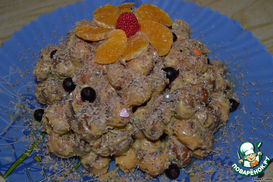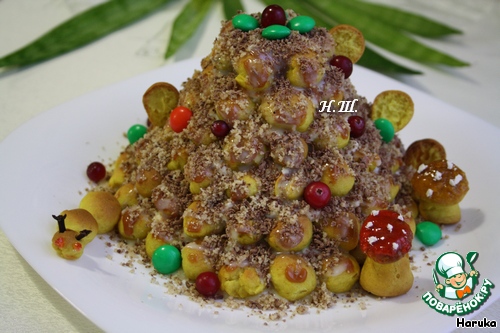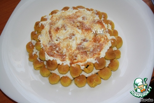 У меня творожный: творог размять толкушкой и смешать с 2 ст. ложками сгущенного молока. Шарики укладываем слоями, слои смазываем кремом и вареной сгущенкой. -