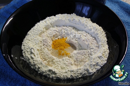Замесить тесто: смешать в чашке муку, сахар, дрожжи и куркуму. Я использовала обычную муку с добавлением цельнозерновой.
