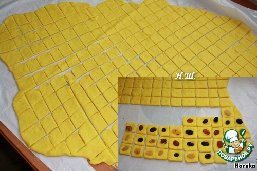 Тесто раскатать в тонкий пласт и разрезать на маленькие квадратики 1,5x1,5см, можно меньше. В каждый квадратик завернуть изюминку и скатать шарик.
