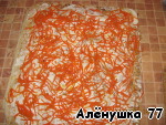 Колбасу и сыр натереть на крупной тёрке. Укроп мелко порезать. Положить первый лаваш, смазать майонезом и разложить морковь.