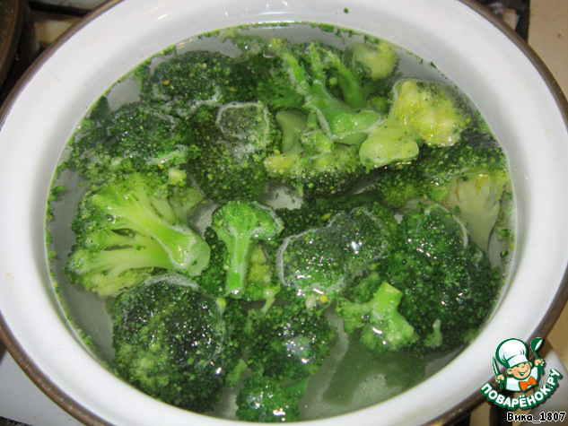 В подсоленной воде отварить брокколи примерно 5 мин. Откинуть на дуршлаг и дать стечь жидкости.
