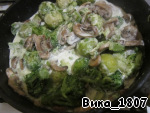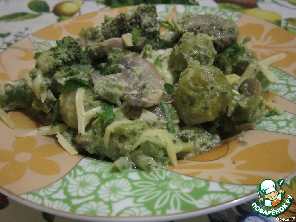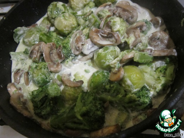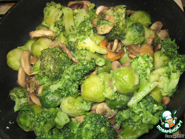 Обжарить по отдельности на смеси растительного и сливочного масла брокколи, брюссельскую капусту и грибы (капусту обжаривать примерно по 5 мин., грибы - 15 мин.)