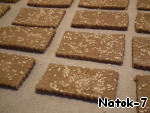 Посыпать пласт теста кунжутом, немного уплотнив его на поверхности скалкой. Смазать взбитым яйцом и разрезать на прямоугольники.