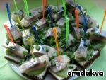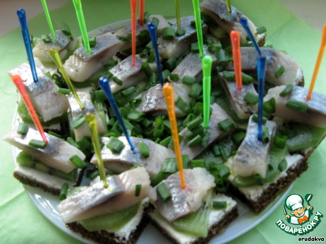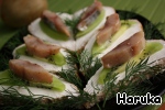 Канапе готовы, перед подачей на стол украсить зеленью. Автор рецепта (рецепт подсмотрен в журнале "Кулинарная коллекция") рекомендовал украсить листом мяты. Я же предпочла более классическое сочетание и посыпала мелко нарезанным зеленым луком.