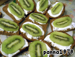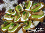 Спелые плоды киви очищаем от кожуры, режем тонкими ломтиками и выкладываем на смазанный сыром хлеб.