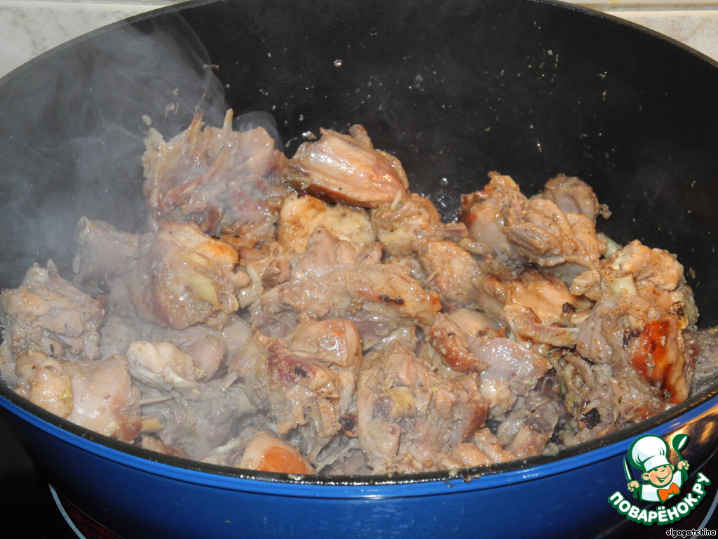 Накройте крышкой и потушите 30-40 минут. Если курица даст мало сока, добавьте немного воды. Это делается потому, что домашняя курица жестче, чем покупная.