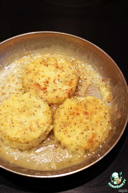 Как только карамель начнет слегка золотиться, положить на сковороду гренки. Сковородку надо наклонять в разные стороны, встряхивать, чтобы вся карамель впиталась в тосты.