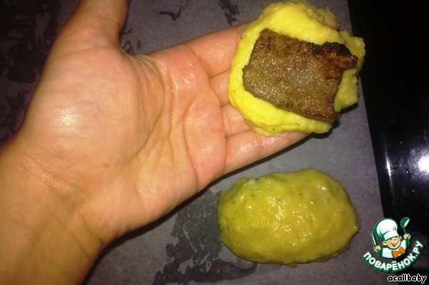 Из сваренного до готовности картофеля делаем пюре: слить всю воду, добавить тертый сыр, яйцо, муку и специи. Растолочь и поставить остудить. |