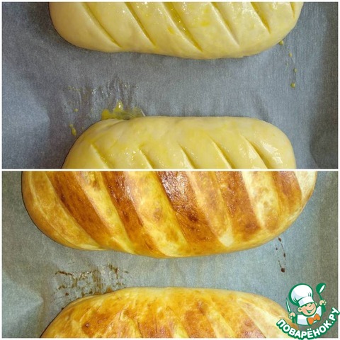На батоне сделать надрезы. Можно смазать молоком или яйцом, чтобы была красивая корочка.