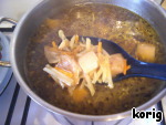 В 3-х кастрюлю наливаем 2литра воды, добавляем грибы замоченные и замороженные. После закипания ждем 15 мин.