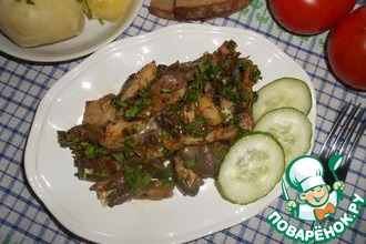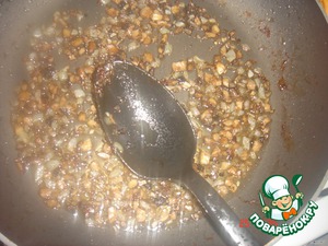 Ножки грибов, лук и чеснок мелко порубить, и обжарить на растительном масле.