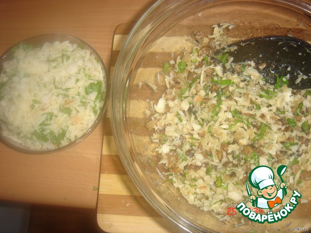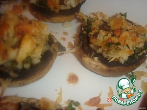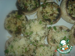 Начиняем наши шляпки грибов полученной смесью, а оставшуюся хлебно-сырную массу с петрушкой выкладываем сверху первой начинки.