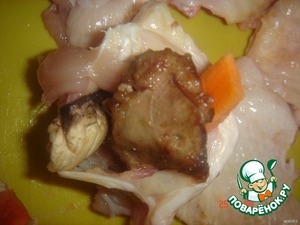 Теперь самое интересное. Берем филе нашего крылышка и вкладываем в него ломтик шампиньона, морковки и печеночки.