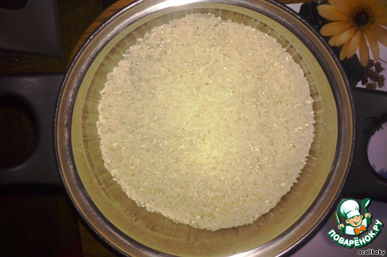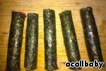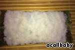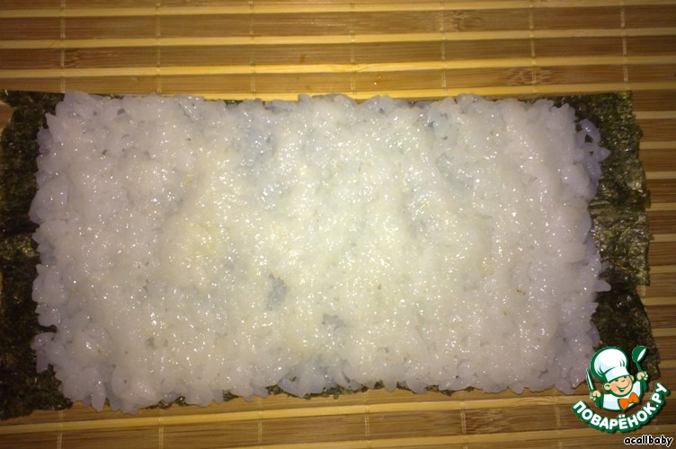 Берем большую половинку листа Нори. Выкладываем на нее рис.