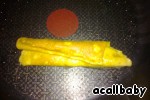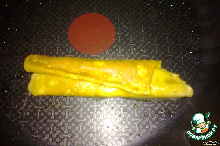 На разогретую сковородку капаем немного подсолнечного масла, тонким слоем льем треть омлета, подравнивая растекающиеся края лопаточкой. Когда он схватился (секунд 30), сворачиваем его края, как на картинке.