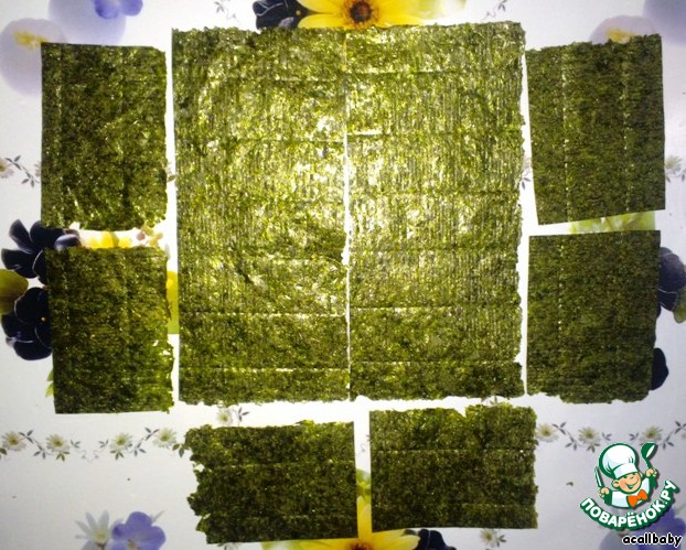 Теперь приступаем к приготавливанию Нори. Один лист режем пополам (вдоль полосок).