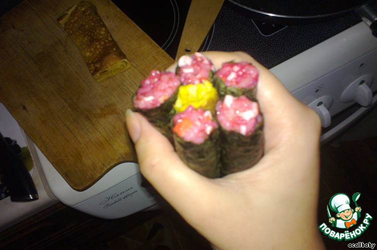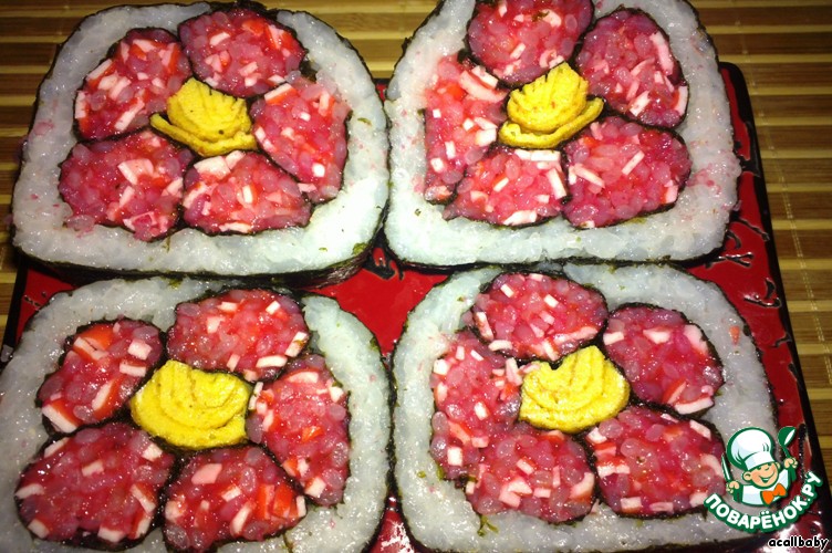 Соединяем все пять маленьких роллов с красным рисом, посередине помещаем кусочек отрезанного тамаго. Для удобства можно их скрепить небольшим кусочком Нори (чтобы держали форму, тем более, у нас остался лишний кусочек Нори)
