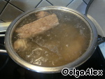 Бульон делим на 2 части, в одной остаётся мясо, во вторую добавляем воды и ставим на огонь для закипания.