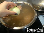 По истечении 2-х часов бульон солим и опускаем в него луковицу и лавровый лист.