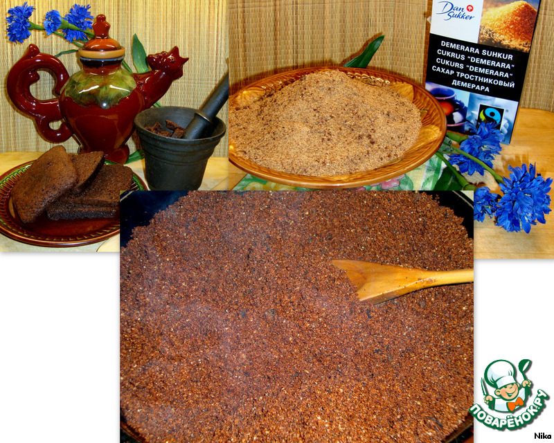 Этот хлеб - панировочные сухари я делала для рецепта, который выставлю позже. Чёрствый черный хлеб молотый жарила с сахаром, постоянно помешивала, чтобы не сгорел. В готовом виде он немного карамелизуется, рассыпчатый и чуть с горчинкой.