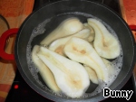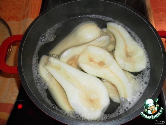 Груши почистить и разрезать, сердцевину и плодоножку удалить. Белое вино, лимонный сок, 400 мл воды и 75 г сахара вскипятить. Груши положить в кипящий отвар и варить 15-20 минут, пока они не станут мягкими.