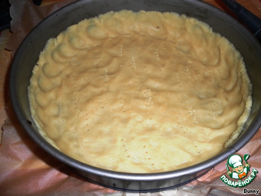 Сметану, 50 г сахара, растопленый шоколад и 2 яйца смешать. Тесто раскатать и выложить в форму, края прижать, дно наколоть вилкой.