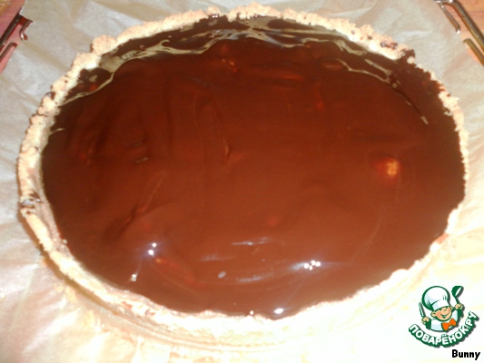 Горький шоколад порубить. Шоколад и 25г масла растопить в кастрюле, постоянно помешивая и распределить по остывшему тарту. Тарт выставить на холод примерно на 1 час, пока не застынет шоколад.