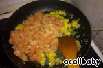 Добавить порезанное на кубики куриное филе. Протушить под закрытой крышкой минут 5, затем помешать курочку, добавить специи, соль и снова протушить под крышкой минут 5.