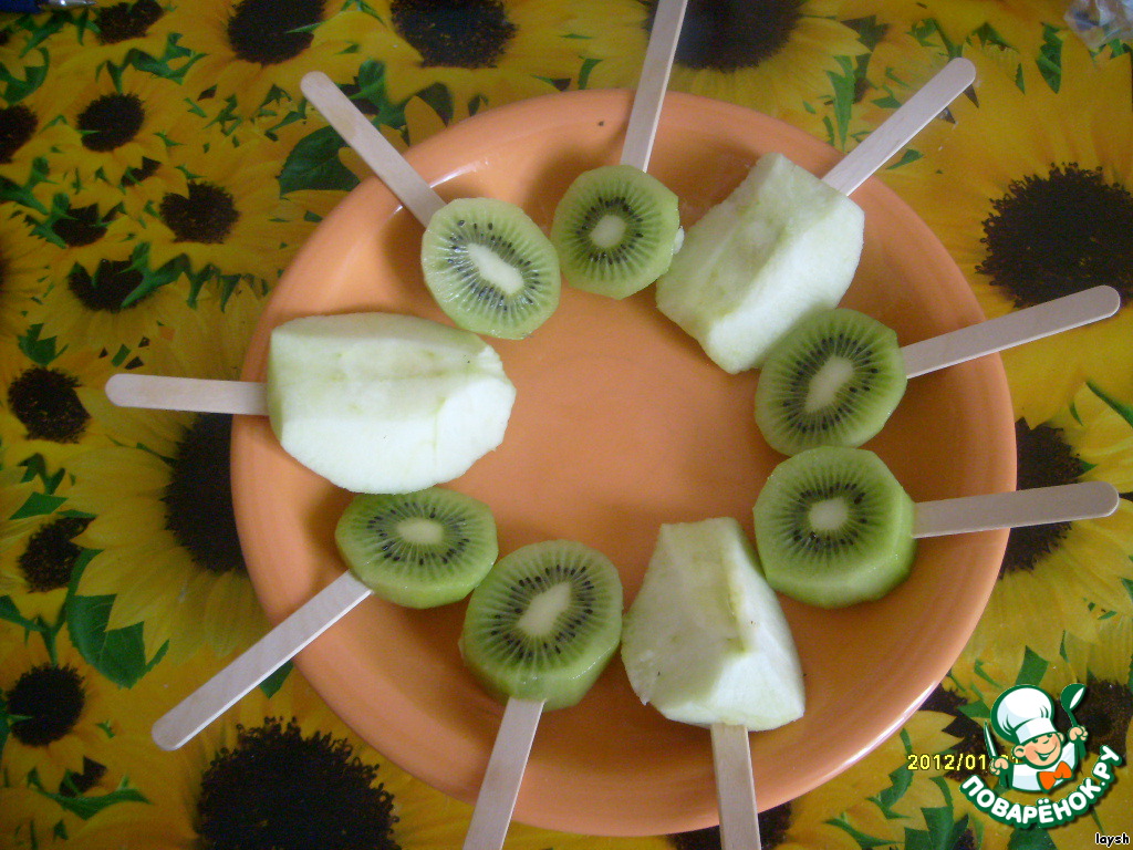 Насадить фрукты на палочки и положить в морозилку на 30 минут.