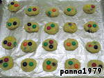 На этом этапе можно уже остановиться и отправить печенье в духовку, но можно еще немного и приукрасить. Для этого нам понадобится оставшаяся упаковка конфет. Выложим дражже сверху на печенье. Главная трудность в приготовлении этого печенья заключается в невозможности отогнать от процесса приготовления детей, а еще уследить за тем, все ли конфеты используются по назначению. :)