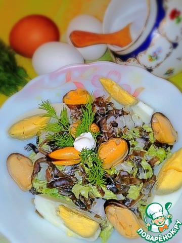 Смешиваем кольца кальмара и пекинскую капусту, выкладываем сверху "подушки" из морской капусты.