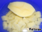 Очищенный картофель разрезать пополам, одну часть нарезать кубиками, вторую так оставить, залить водой минут на 15, во-первых, поможет избежать аллергии на крахмал (крахмал при этом выходит), а во-вторых, все нитраты выводятся, если картофель не со своего огорода.