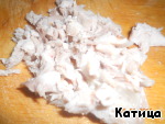 Сваренное перепелиное мясо нарезать очень, очень мелко (у меня дочь еще не совсем может пережёвывать мясо, поэтому я ей режу мелко), ножки оставить для второго.