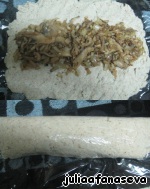 На пищевой пленке сформировать пласт из рыбного фарша примерно 1,5см толщиной. Выложить в центр остывшую начинку из грибов и лука. Сформировать рулет