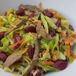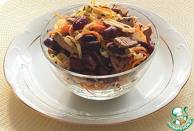 Салат привлёк именно своим необычным сочетанием. Никаких пропорций в рецепте нет, поэтому сделала на свой вкус : 1 луковицу, 1 морковь, 1/4 часть вилка капусты, пол дозы фасоли и 200 грамм печени, майонез нам показался лишним. Получ лся отличный салат, рекомендую попробовать! Спасибо за рецепт!