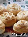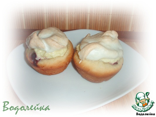 Тем временем взбейте оставшийся белок с 2 ст. л. сахарной пудры и щепоткой соли до острых пиков. И из кондитерского мешка нужно высадить белок на булочки. У меня такого приспособления нет, поэтому получилось не совсем красиво…