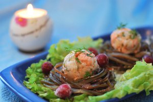 Выкладываем шарики посредине "гнёздышек" из морской капусты. Украшаем ягодами клюквы.