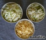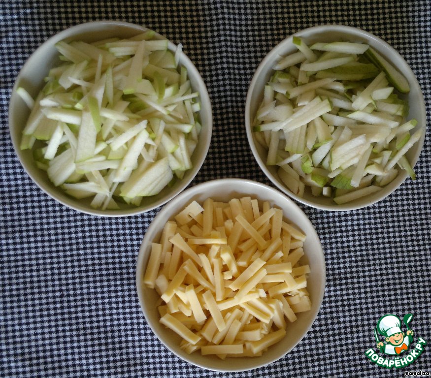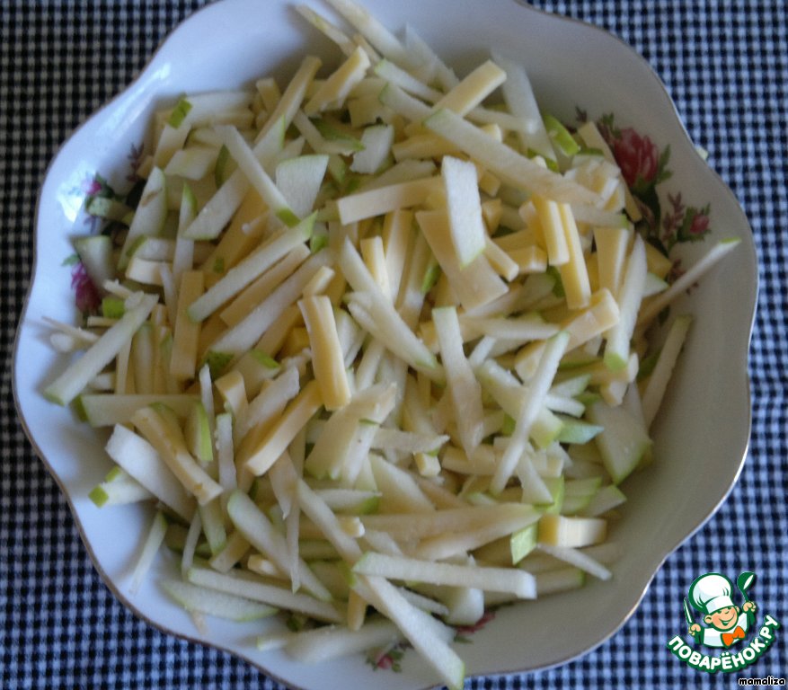 Яблоко, грушу и сыр нарезать одинаковыми брусочками.