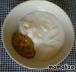 Приготовить заправку из майонеза, йогурта, горчицы, лимонного сока, соли и сахара по вкусу.