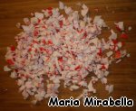 Мелко режем крабовые палочки или мясо,