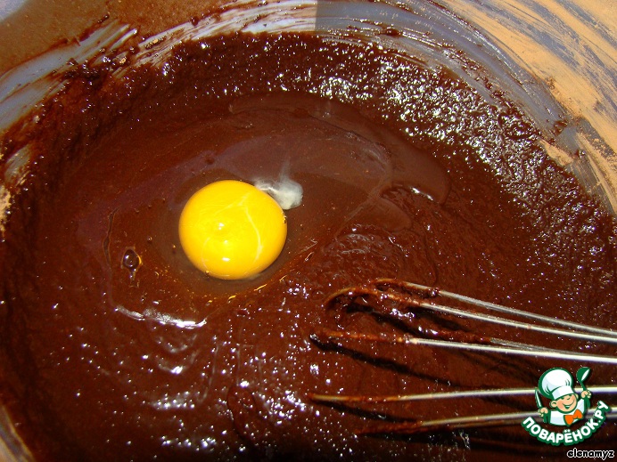 Растопленное масло влить к шоколаду, затем перемешать венчиком до однородности.